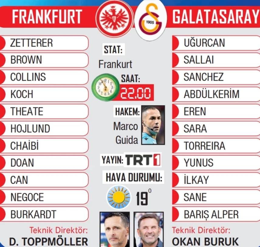 Okan Buruk yönetiminde Süper Lig’de 5’te 5 yaparak sezona kusursuz bir giriş yapan sarı-kırmızılılarda önemli bir eksik bulunuyor. Sakatlığı süren Victor Osimhen, Frankfurt deplasmanına götürülmedi. Buruk’un, santrfor bölgesinde Barış Alper Yılmaz’a görev vermesi, tam hazır olmayan Mauro Icardi’yi ise yedek kulübesinde tutması bekleniyor.